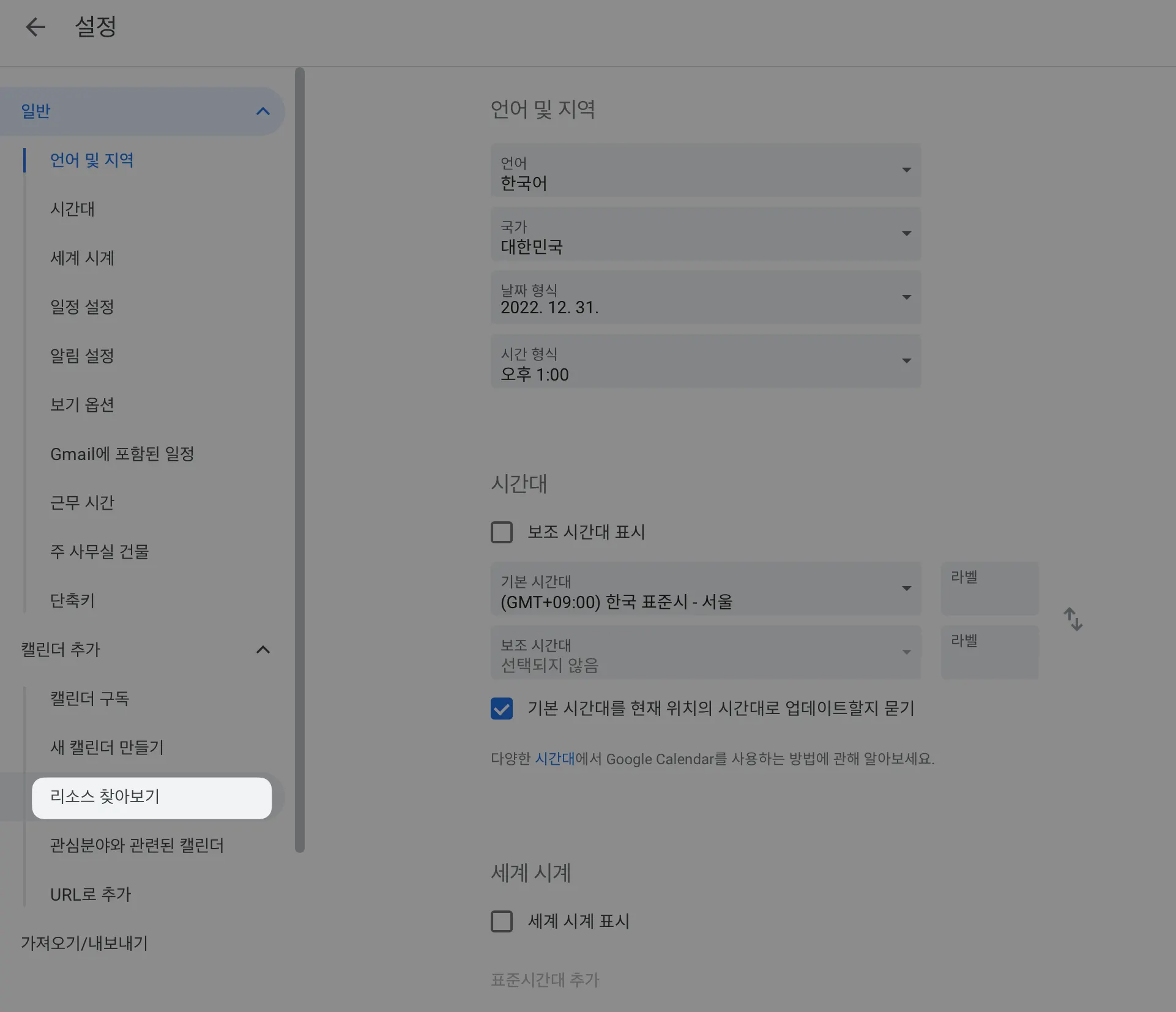 좌측 캘린더 추가 메뉴에서 리소스 찾아보기를 선택합니다.