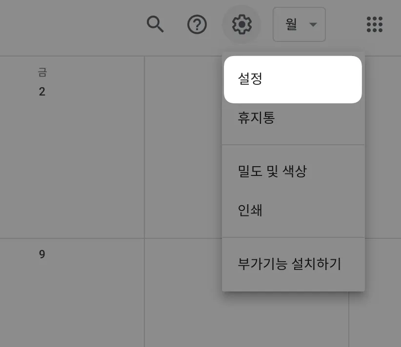 Google 캘린더에 진입 후 우측 상단에 있는 설정 메뉴를 선택합니다.