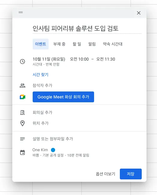 Google 캘린더에 원하는 시간을 선택해 일정을 선택 후 ‘회의실 추가’를 선택합니다.