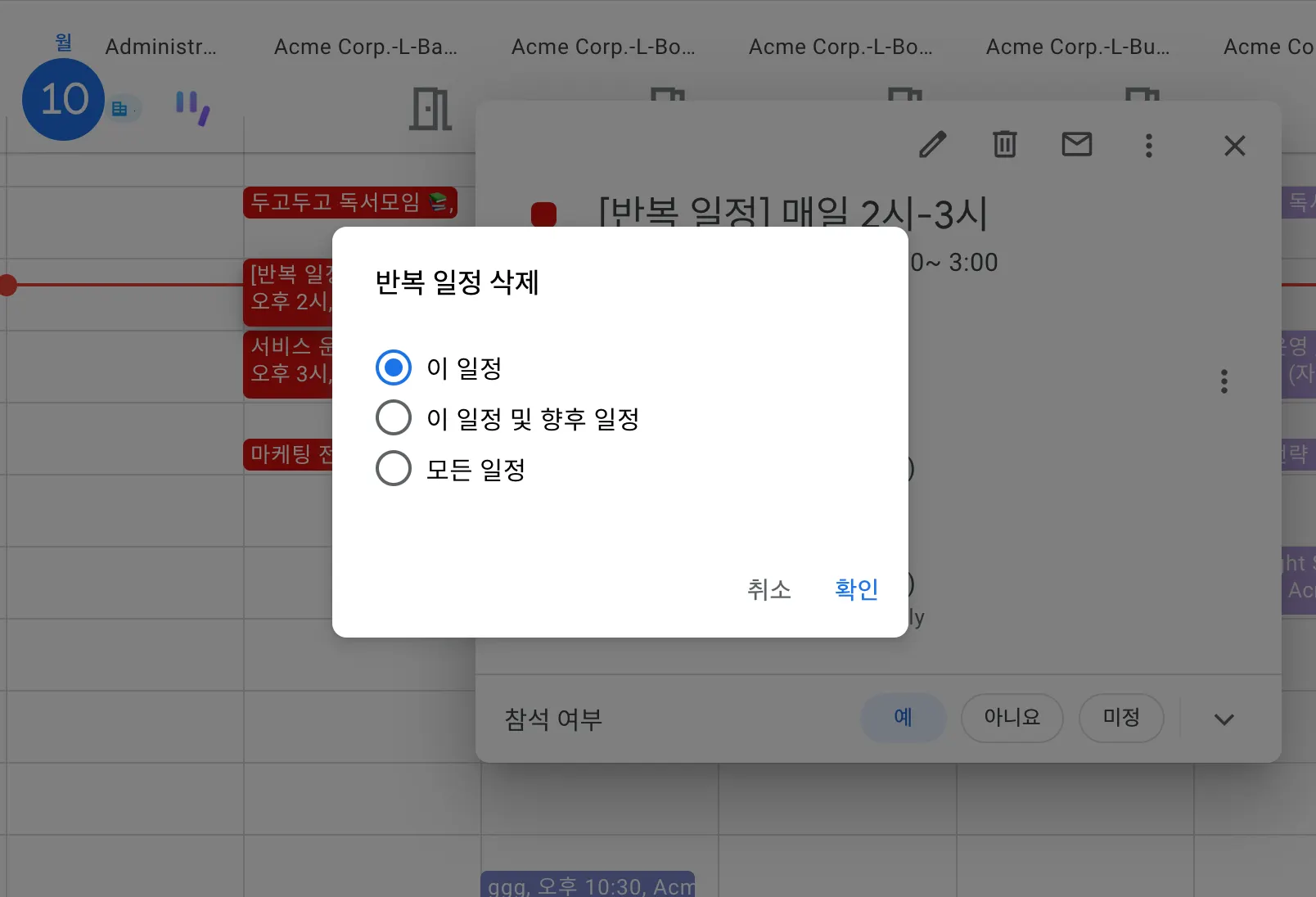 - 이 일정 : 반복 일정 중에서도 선택한 해당 일정만 단일로 삭제