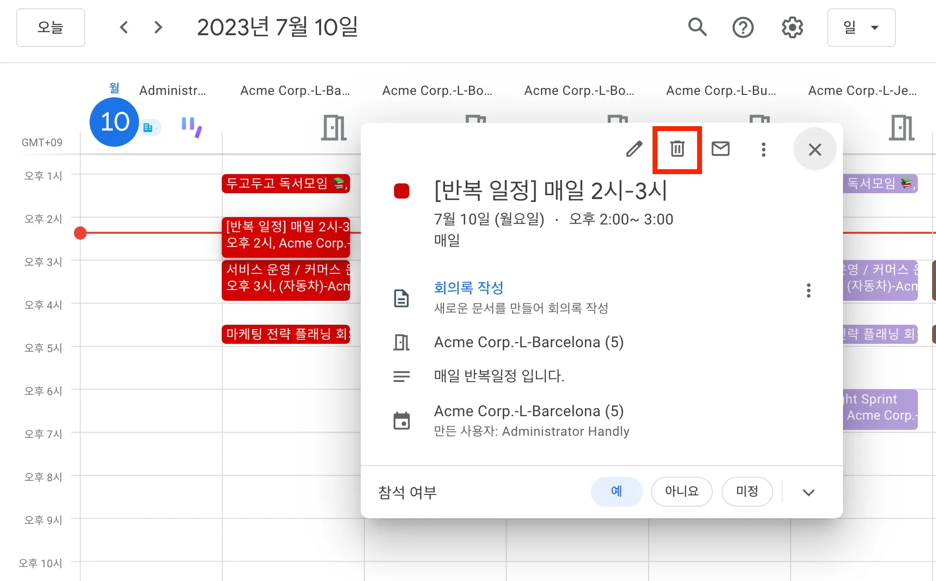 삭제 할 반복 일정을 선택 후 ‘삭제 아이콘’을 선택합니다.