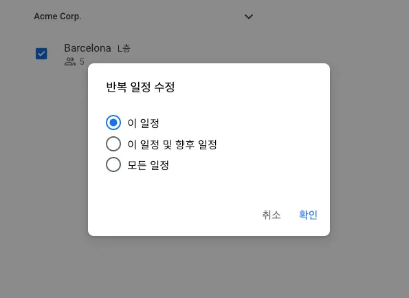 반복 일정 수정 팝업이 출력되면, 원하는 일정 수정 방식을 지정 후 [확인] 버튼을 선택합니다.