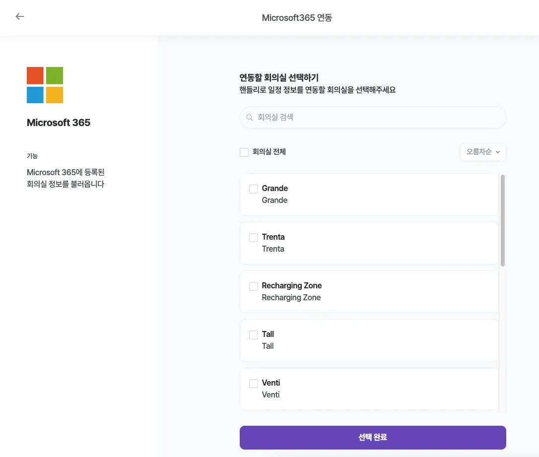 연동은 Microsoft 365 관리자 권한이 필요하며, 회의실 리소스도 사전 생성되어야 합니다