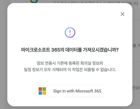 Microsoft 365 관리자 계정이 아닌 경우 연동 실패 또는 일정 동기화에 문제가 발생할 수 있습니다.