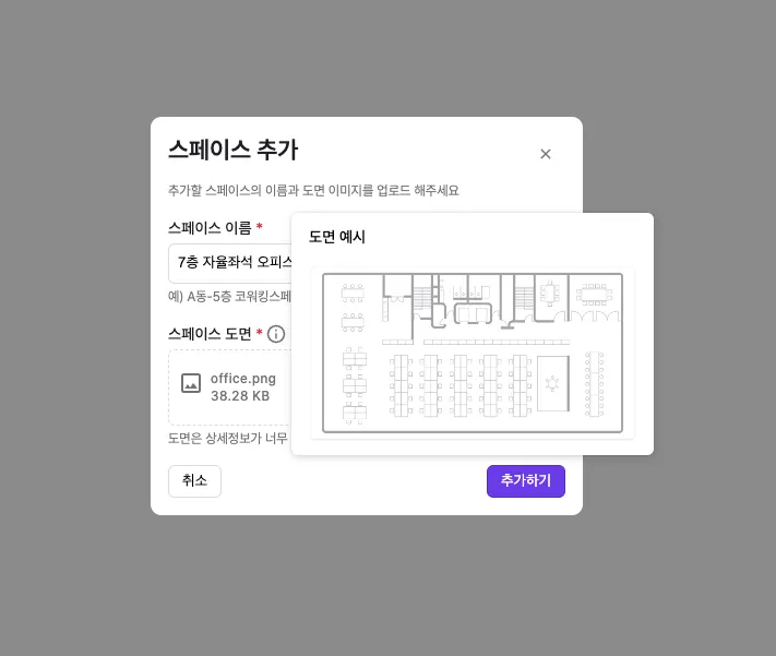 스페이스를 구분하는 이름을 입력하고 업로드할 도면을 선택합니다. (이름과 도면은 추후 변경이 가능합니다)