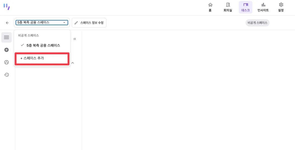 좌측 상단의 스페이스 목록에서 '스페이스 추가'를 선택합니다.