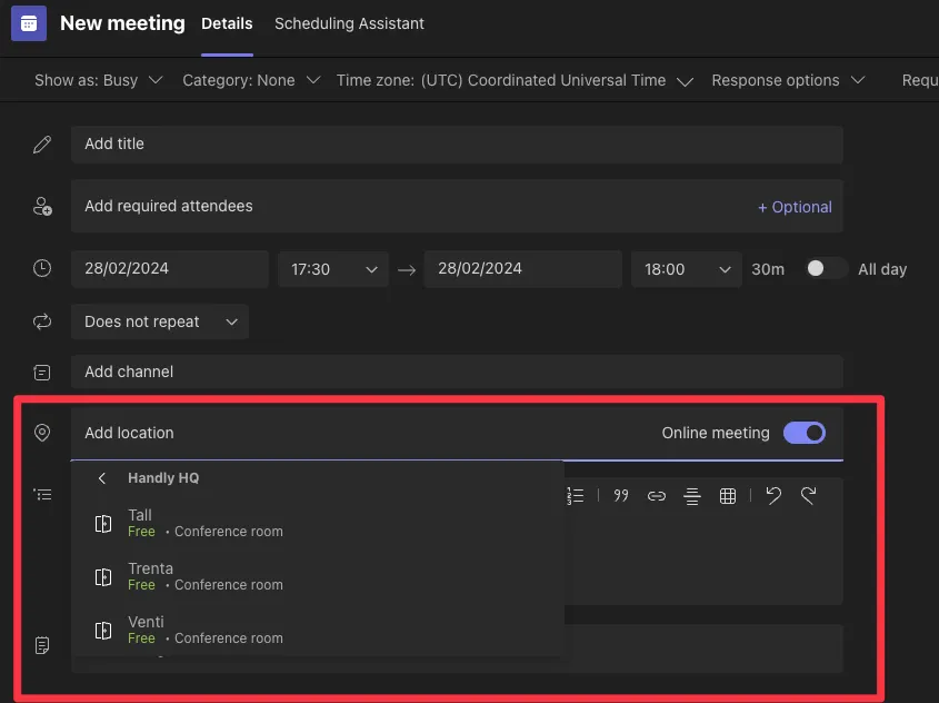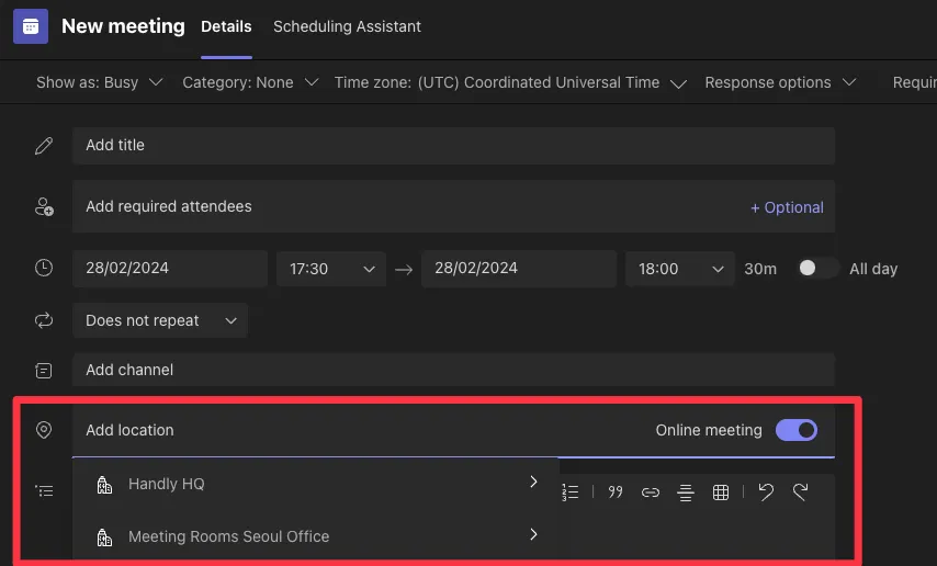 등록이 완료되면 Microsoft Teams에서 등록된 장소를 선택해 일정을 예약할 수 있습니다.