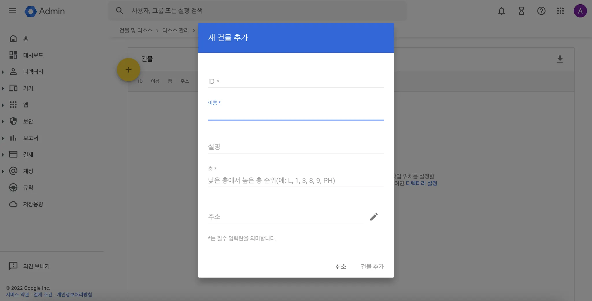 새 건물 추가 팝업에 건물 이름, 설명, 층, 주소 등의 기본 정보를 입력 후 ‘건물 추가’ 버튼을 선택합니다.