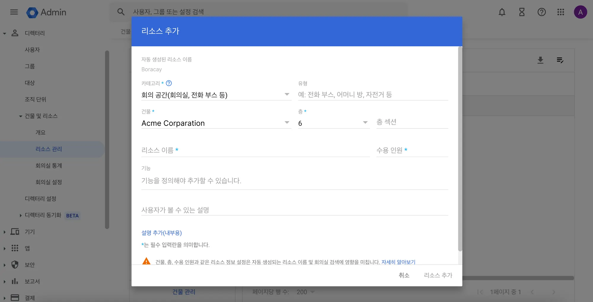 리소스(회의실) 정보를 입력 후 우측 하단의 ‘리소스 추가’ 버튼을 선택합니다.