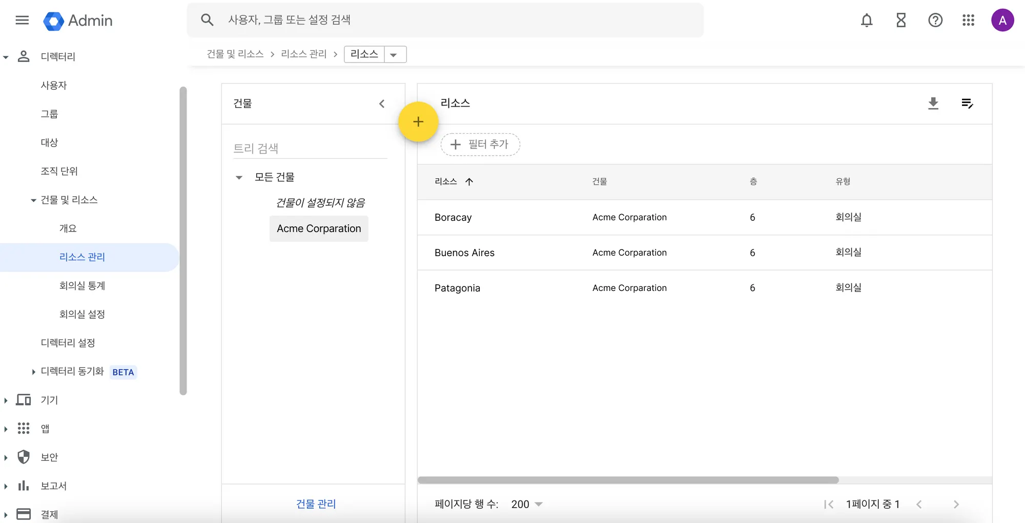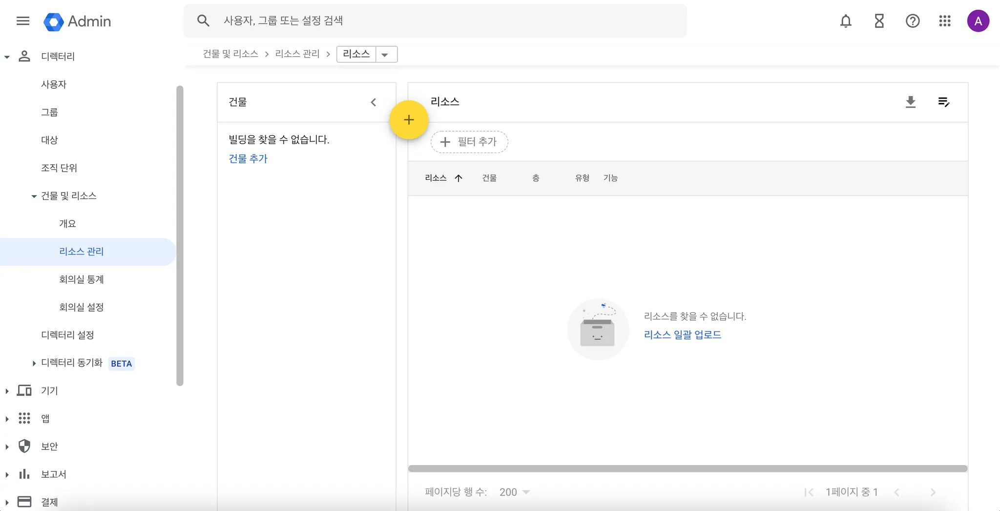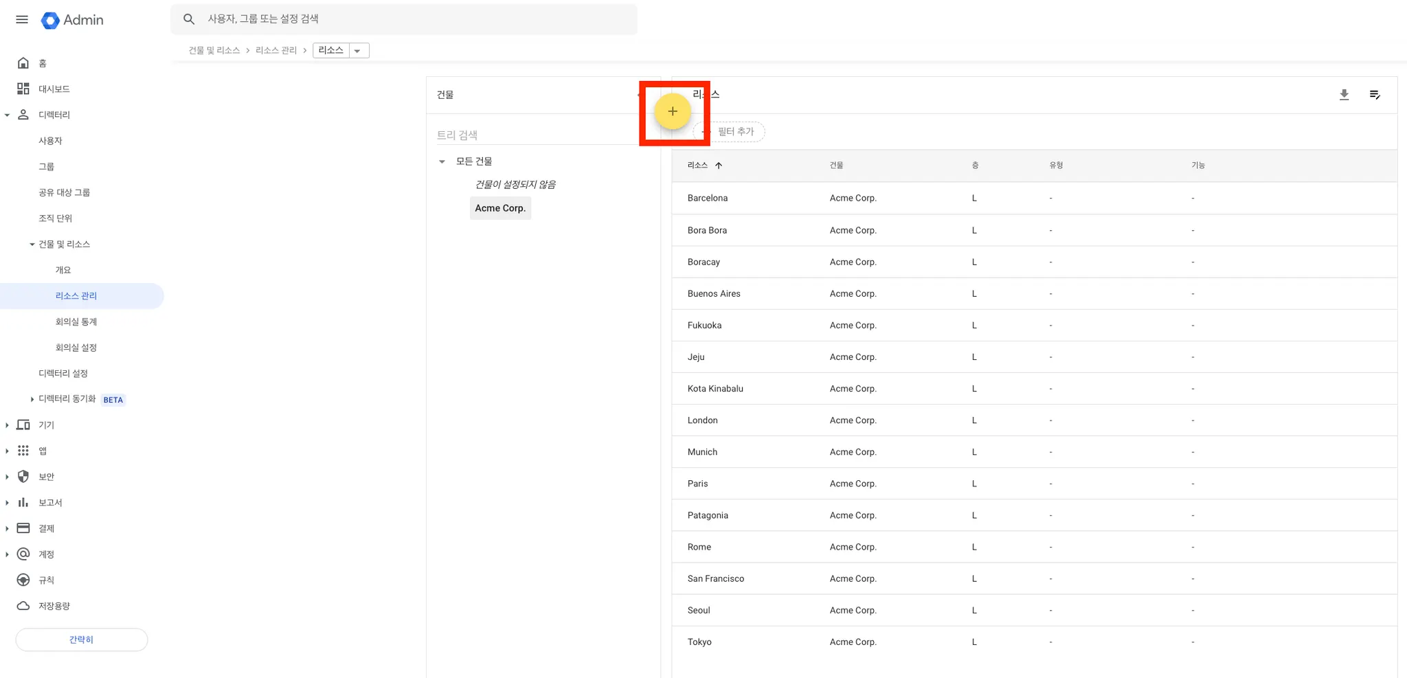 건물 추가 완료 후 추가한 건물 선택 후 노란색 + 버튼을 선택해 리소스(회의실)을 추가합니다.