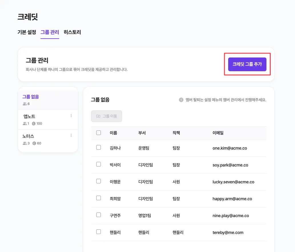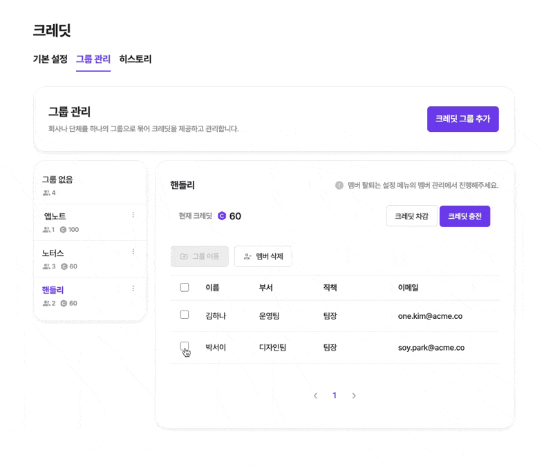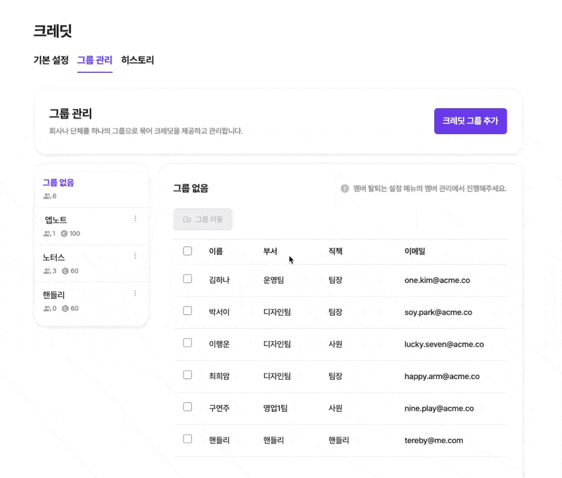 크레딧 > 그룹 관리에서 추가하고 싶은 멤버를 원하는 크레딧 그룹으로 이동합니다.