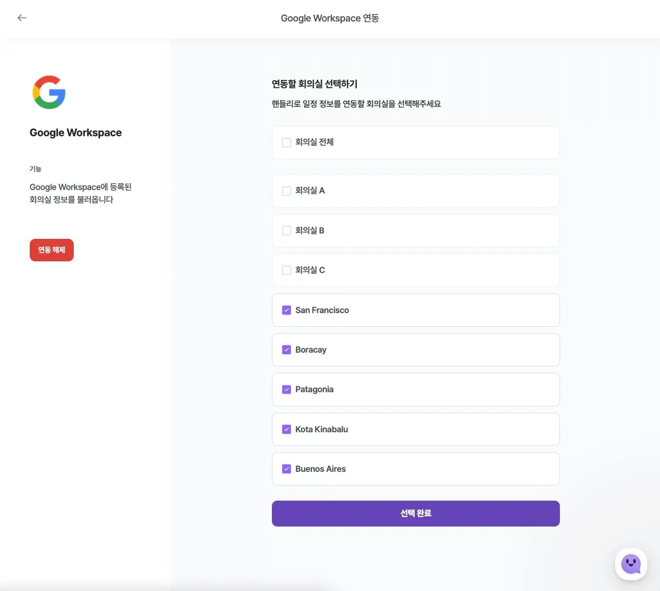 * Google Workspacs 연동 해제시 예약사이트에 등록된 회의실 및 일정 정보가 모두 삭제되므로 주의가 필요합니다.