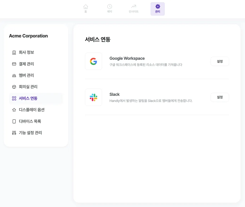 서비스 관리자, 일반 관리자는 관리 - 서비스 연동 또는 관리 - 회의실 관리 메뉴에 진입이 가능해 Google Workspace 연동 및 해제가 가능합니다.