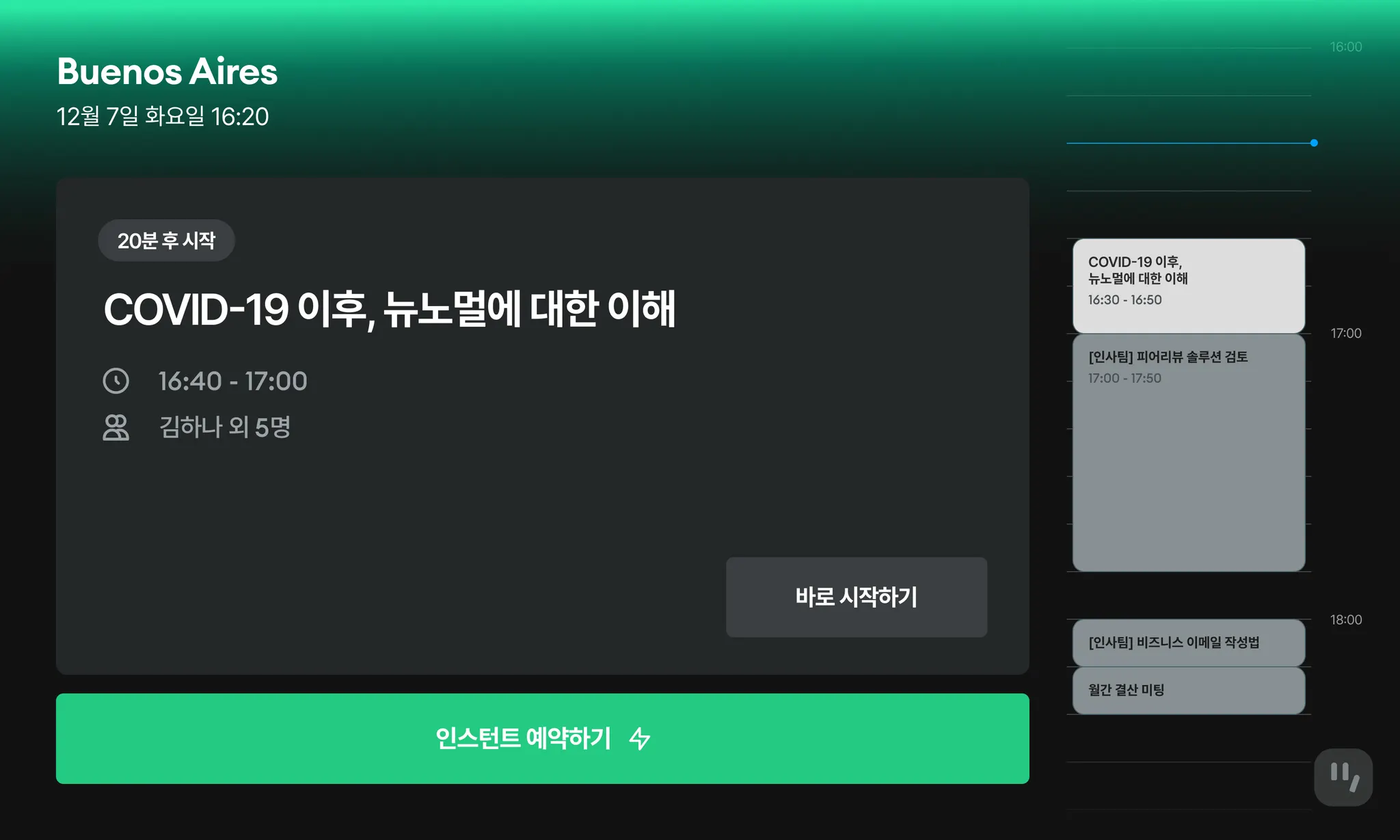 디스플레이와 연결하면 지정한 회의실에 대한 일정 확인 및 빠르고 간편한 인스턴트 회의를 생성하는 등의 서비스를 이용할 수 있습니다.