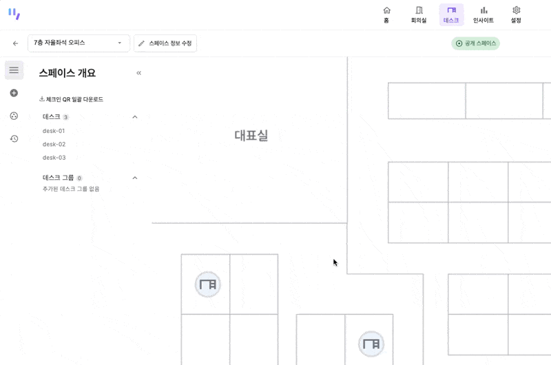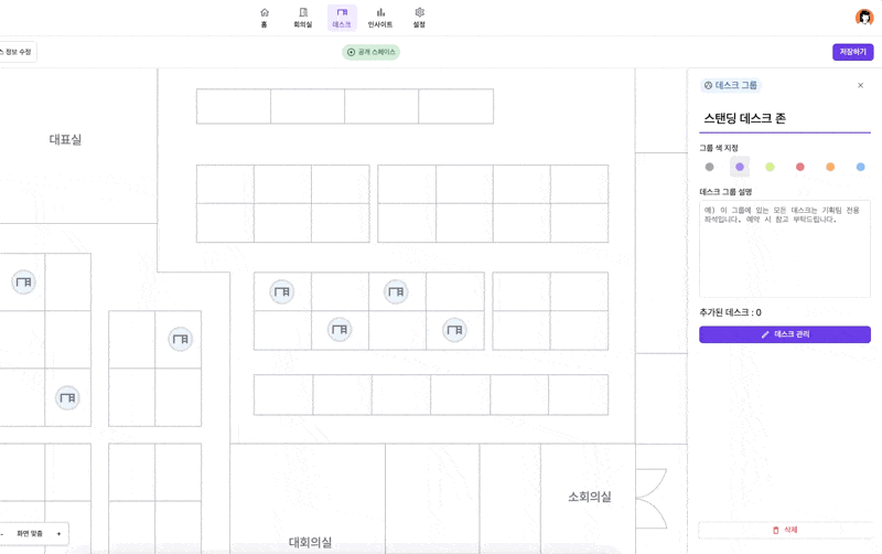 각 그룹에 할당된 좌석이 구분되어 스페이스에 표시되며 데스크의 특징, 속성에 따라 자유롭게 구분이 가능합니다.