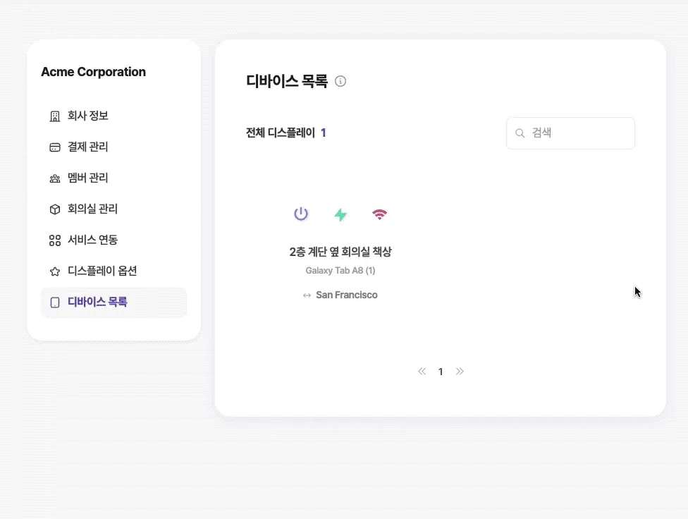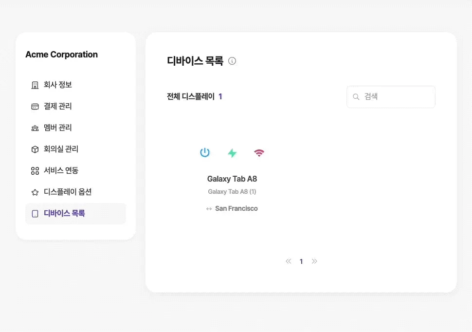관리 > 디바이스 목록에서 회의실과 연결된 디바이스를 확인할 수 있습니다. 디바이스가 연결되는 순간 기기의 정보는 자동으로 등록됩니다. 연결된 디바이스에 대해 제공하는 정보는 아래와 같습니다.
