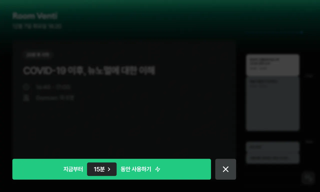 * 이때, 15분동안만 인스턴트 예약을 하려고 할 경우 ‘지금부터 [15분] 동안 사용하기’ 버튼을 바로 선택해주시면 됩니다.
