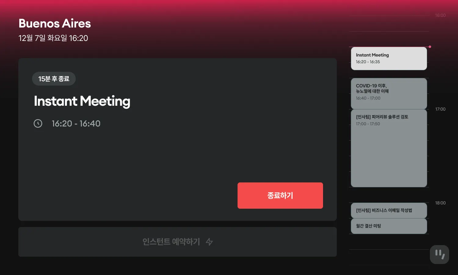 인스턴트 회의는 예약한 즉시 회의실 사용이 가능하며, 이후 회의가 없을 경우 ‘연장하기’ 기능을 통해 15분의 회의 연장이 가능합니다.