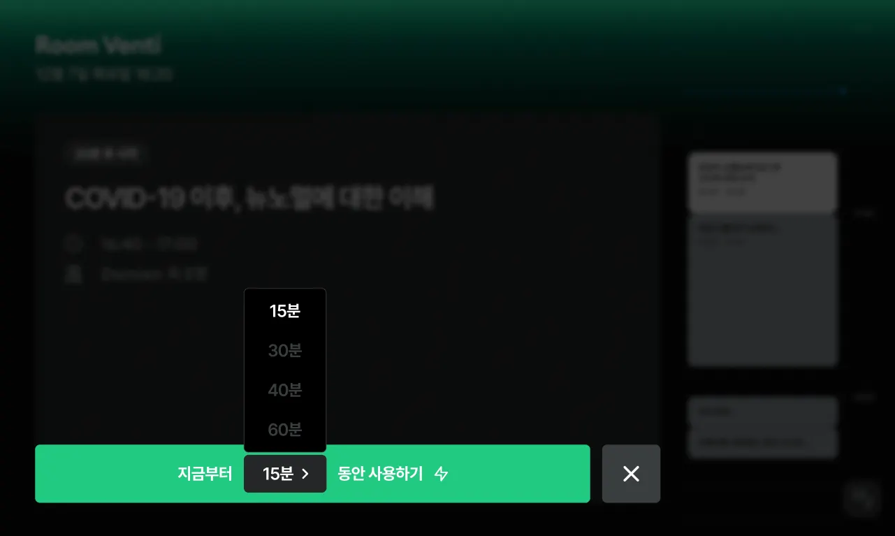 15분/30분/40분/60분 중 회의실을 이용할 시간을 선택합니다.