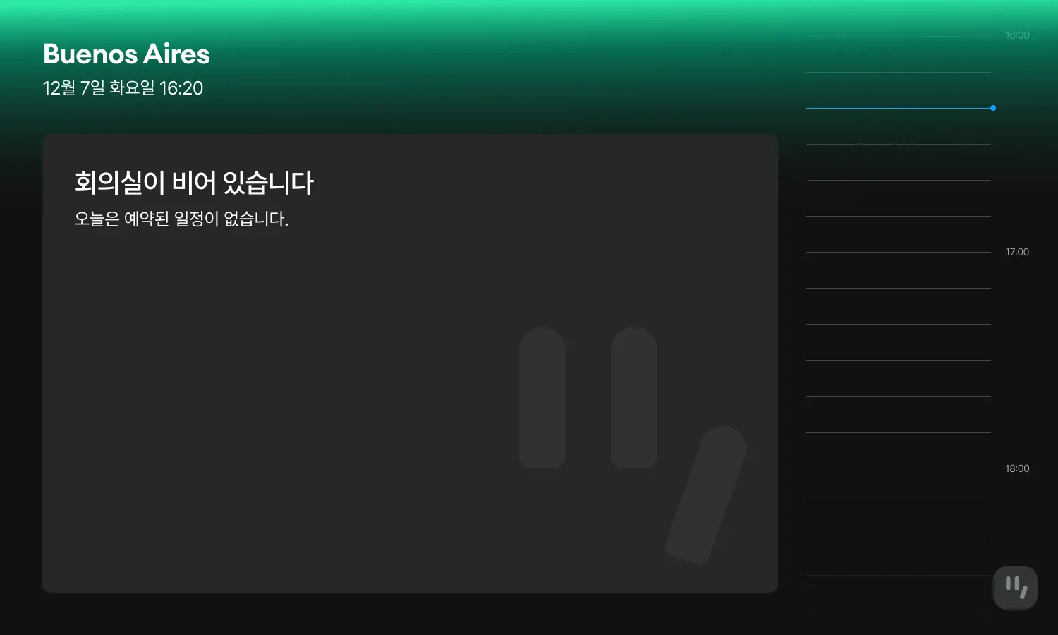태블릿 PC 화면이 녹색 or 파란색이면 해당 회의실 일정 예약이 가능하다는 것을 의미합니다.