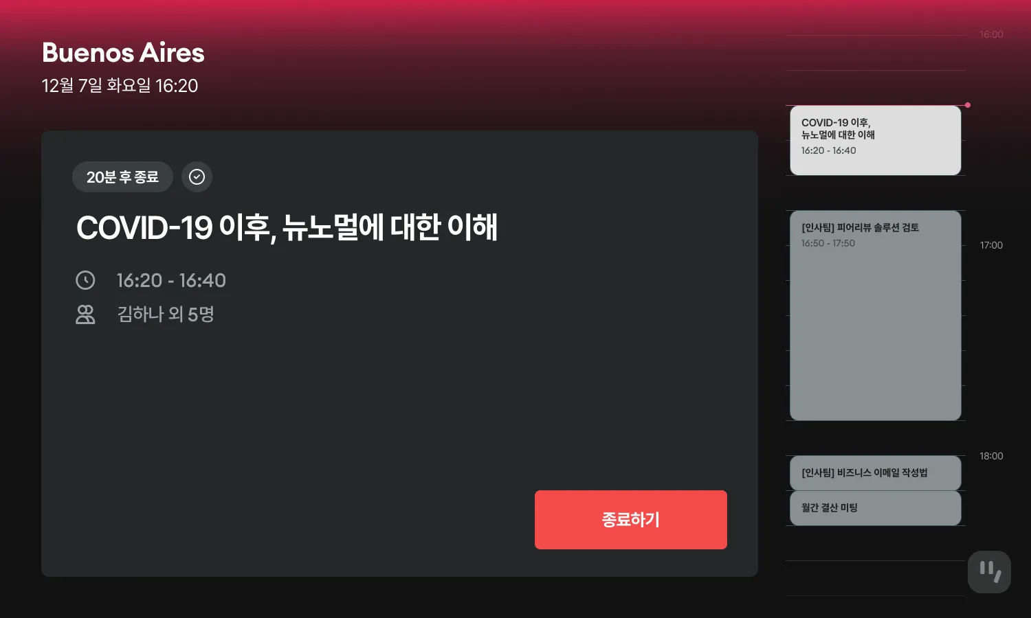 일정이 일찍 종료되는 경우, '종료하기' 버튼을 눌러 예약한 일정보다 빠르게 종료할 수 있습니다.