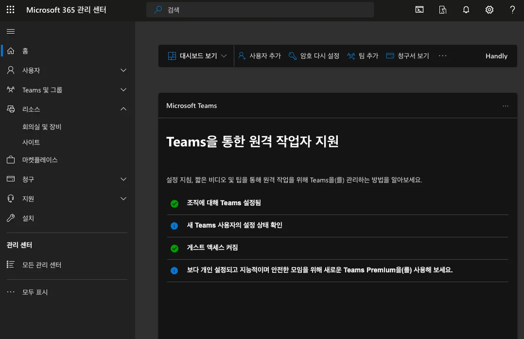 Microsoft 365 관리 센터 페이지에서 좌측 리소스 메뉴를 선택합니다.