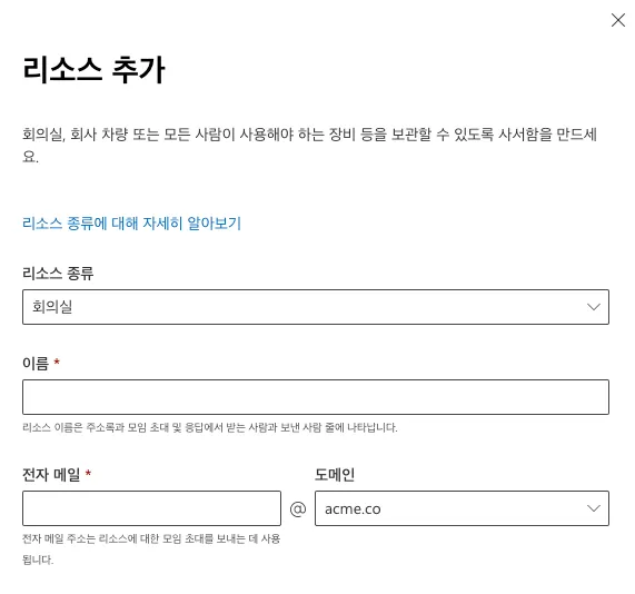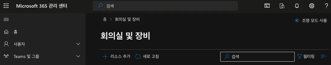 회의실 및 장비 페이지에 진입하면, 리소스 추가를 선택해 새 회의실을 추가합니다.