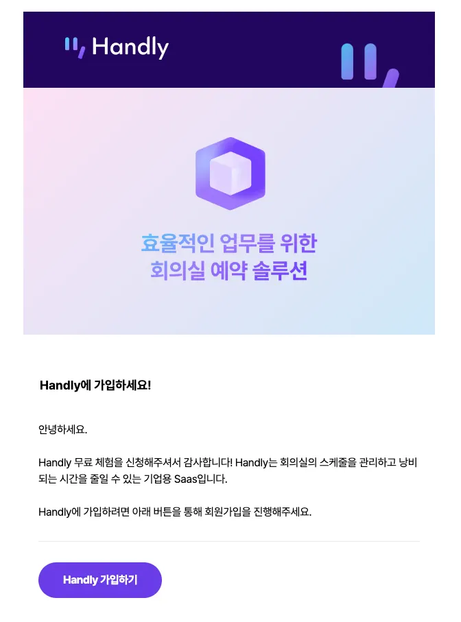 입력한 메일로 Handly 서비스 가입 링크가 발송됩니다.