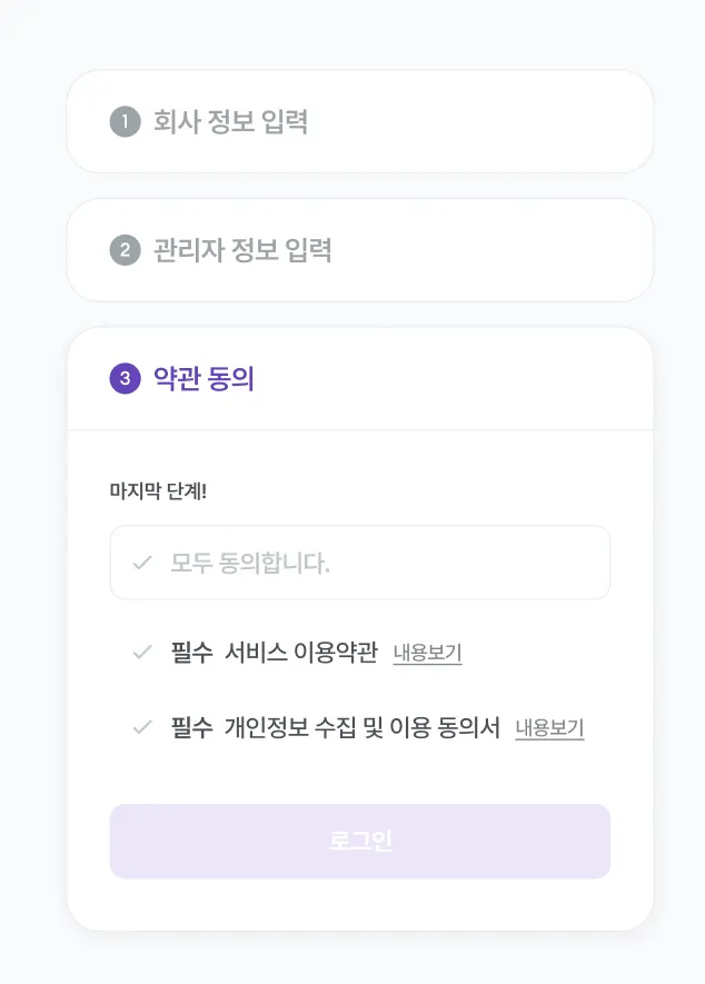회사 정보와 관리자 정보 입력이 완료되었다면, 약관 동의 후 ‘로그인’ 버튼을 선택하면 가입이 완료됩니다.
