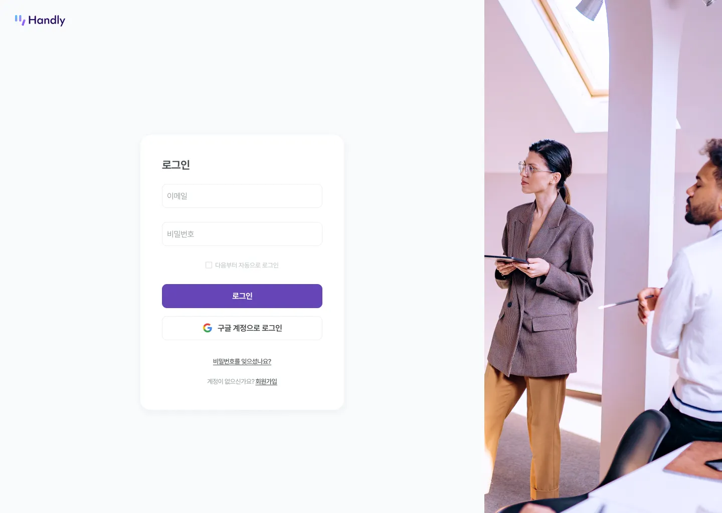 Handly 로그인 페이지에서 ‘회원가입’ 버튼을 선택하거나, 아래 링크를 선택해 진입합니다.