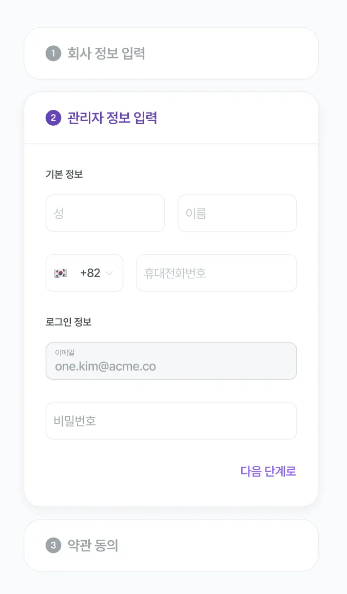 회사 정보 입력이 완료되면, 관리자 정보 입력 후 ‘다음 단계로’ 버튼을 선택합니다.