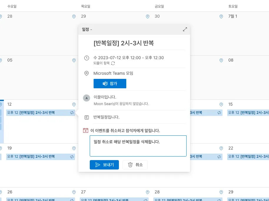 일정 취소 사유(선택사항) 입력 후 [보내기] 버튼을 선택합니다.