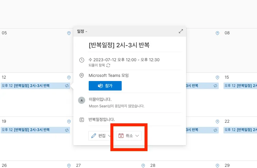 삭제 할 반복 일정을 선택 후 [취소] 버튼을 선택합니다.