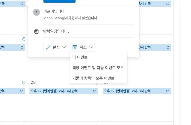 - 되풀이 항목의 모든 이벤트 : 해당 반복 일정의 과거 일정/미래 일정 모두 삭제
